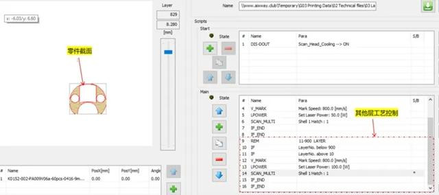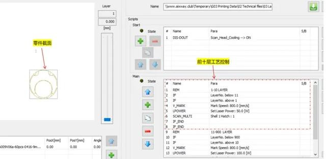 以修改打印激光功率和扫描速度为例,下图展示了针对打印件截面变化大的零件,由于零件前十层截面尺寸较小,为了更好的控制激光热输入,通过条件判断指令“IF”选定前十层,通过“LPower”和“V_Mark”指令修改了前十层的打印激光功率和速度。而对于其他打印层,采用常规的打印激光功率和速度。