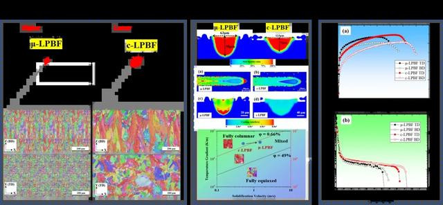 上海科技大学创艺学院智造系统工程中心(CASE)的翟梓融老师课题组在国际学术期刊《Materials & Design》上发表了“Microstructure and mechanical property comparison of Inconel alloys fabricated using micro and conventional laser powder bed fusion”文章。其研究结果表明,微细μ-LPBF中小光斑(光斑直径由传统80 μm降至20 μm)的能量输入可以提高凝固速度,在温度梯度增长受限的情况下,仍可促使柱状晶向等轴晶的转变,从而制造出细晶、弱织构的高温合金组织,且在同一方向的屈服强度有显著提升。此项工作为研究微细μ-LPBF技术在微型特征制造方面的潜力和挑战提供了重要的科学依据。